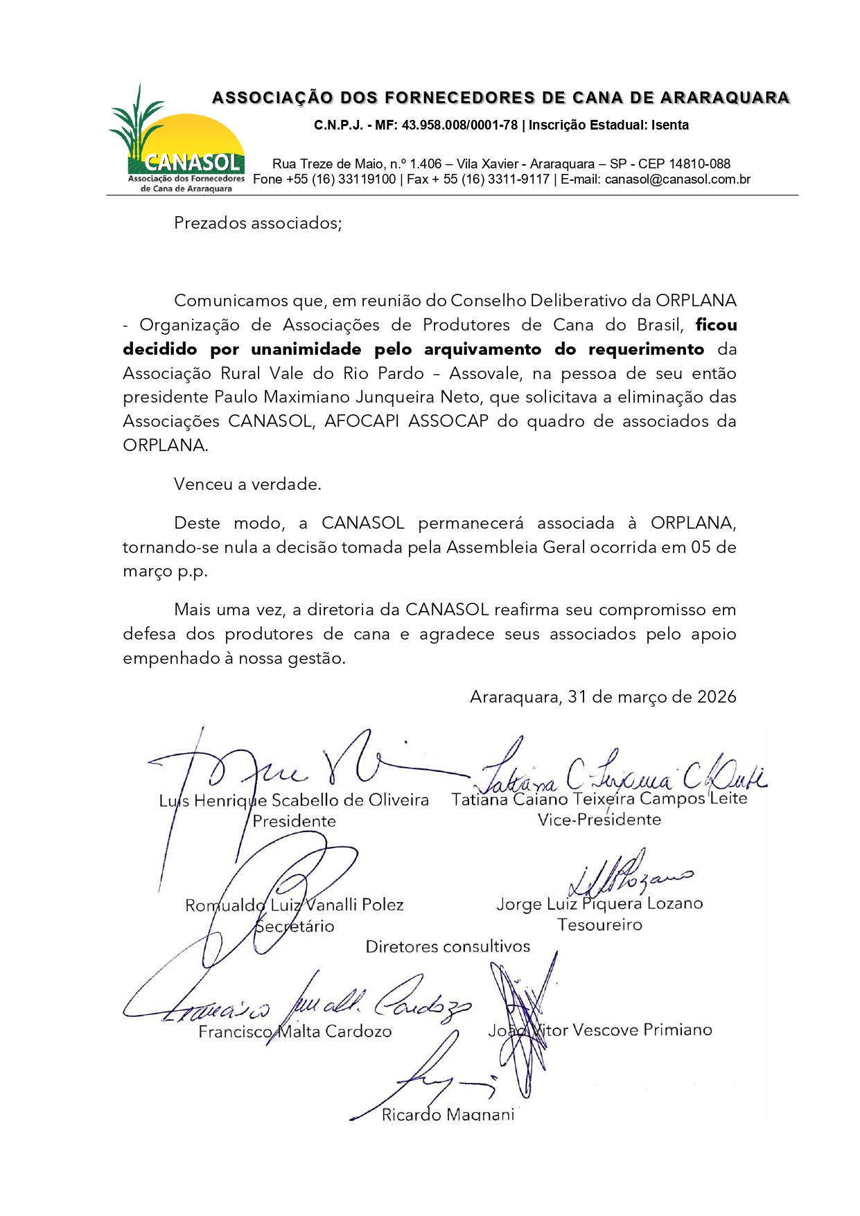 Mais uma vez, a diretoria da CANASOL reafirma seu compromisso em defesa dos produtores de cana e agradece seus associados pelo apoio empenhado à nossa gestão.